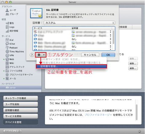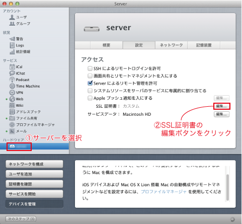 アプリ「Server」を開きます。サイドバーのハードウェアのサーバーを選択して①、SSL証明書の編集ボタンをクリックします。
