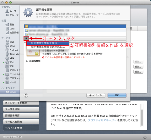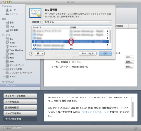 この画面が見たくて、Serverアプリやキーチェーン、エディタ、Safariをぐるぐると、アップルとネットオウルのサポートに連絡しながら、余計な事したりして時間がかかってしまいました。CSRを作成するのはServerアプリと(3)の「デフォルトの無効化」がカギでした。