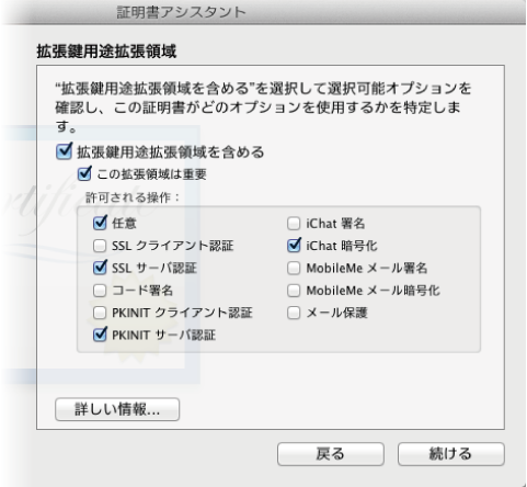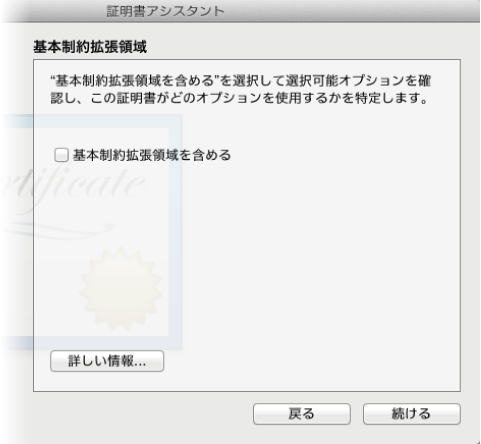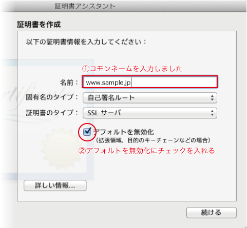 「デフォルトの無効化」はチェックを入れておかないと暗号化されたCSR情報が「コモンネーム」と「国名」の情報のみになってしまい所在地や電話番号などの情報を含むダイアログが後で出てきてくれません。