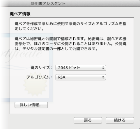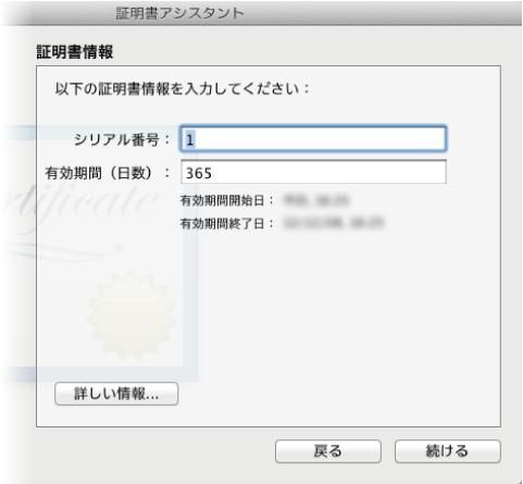 シリアル番号は混乱しそうだったので初期値の1のままにしました。まだ、CSR情報を作成する段階なので、そのまま続けるボタンを押しました。