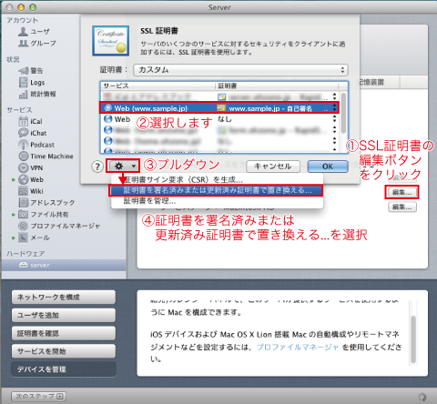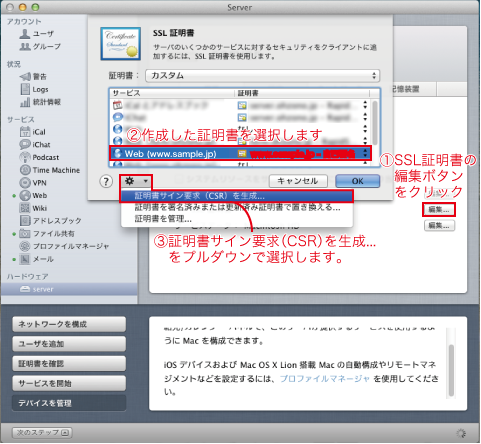 いよいよCSRの暗号の作成です。Serverアプリの①SSL証明書の編集ボタンをクリックします。②目的のサイトと作成した自己署名の証明書を選択して、③の編集メニューより「証明書サイン要求(CSR)を生成...」を選択します。