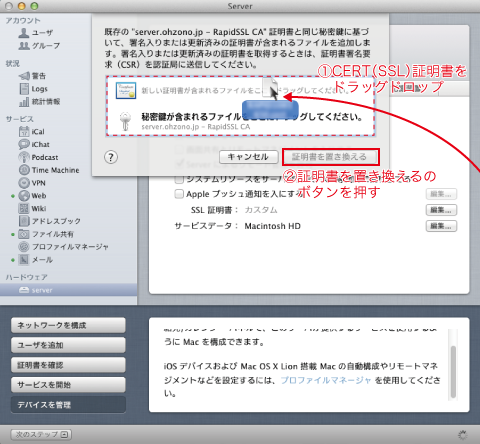先にダウンロードしておいた、CERT(SSL証明書)を①にドラッグドロップします。CSR作成に含まれる暗号情報とSSL証明書に含まれる暗号情報が異なると警告が出てしまいます。②取り込めたら「証明書を置き換える」ボタンを押します。正直、この辺りの記憶が怪しいです。どのファイルが正しかったのか思い出せません。エディタで編集した拡張子がcsrやらcrt、certとどれが本物なのと焦りましたがダウンロードしたCERT(SSL証明書)です。
